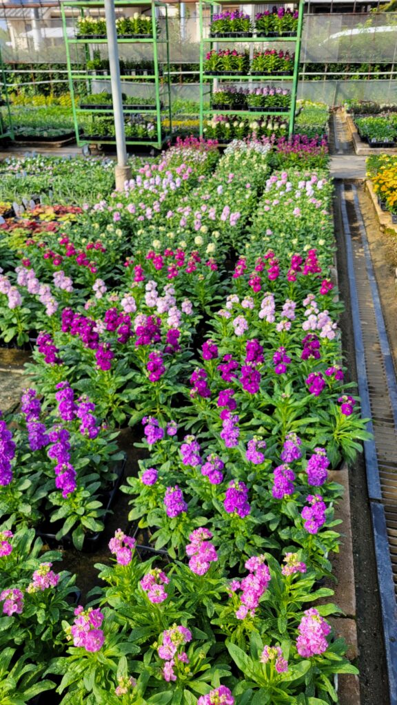 弊社の店頭も衣替えが始まっており、パンジー、ビオラにストック、シクラメンなど次々と冬の花が並び始めてます。