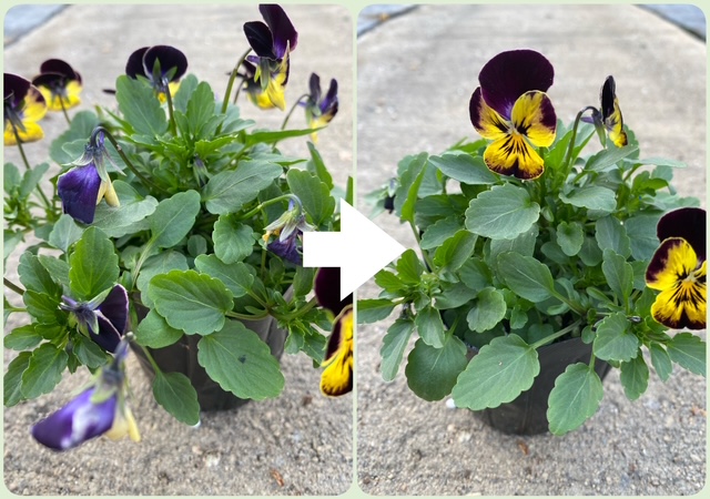 さて今回は、そんな大切に育てた苗がお客様の手元に届く前に行う「出荷作業」について少し紹介したいと思います。出荷作業とは、苗の見た目と状態を整える大切な工程です。株がよく育っていること自体はとても嬉しいのですが、花がらや枯葉がついたままだと印象が悪くなってしまいます。そこで、一つひとつ手作業で丁寧に取り除きながら、綺麗な姿に仕上げていきます。