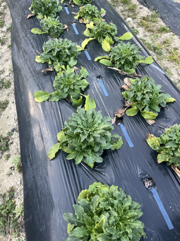 いずれも11月に若い苗を植え付け、欠株することなく露地で冬を越してくれました。霜や寒風に晒されまくりですが、特に傷みもなく成長しています。